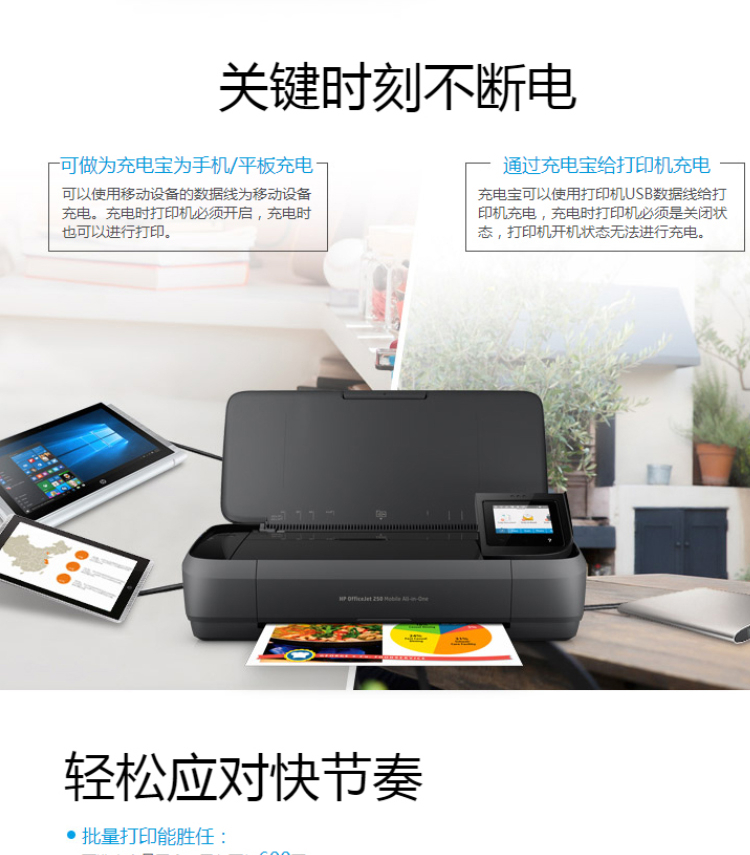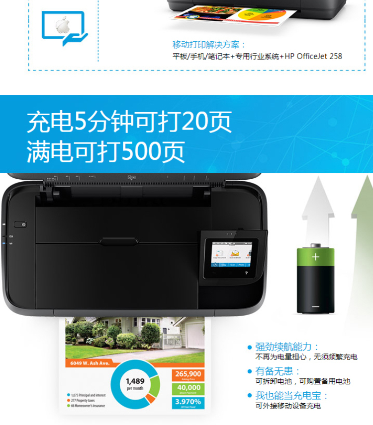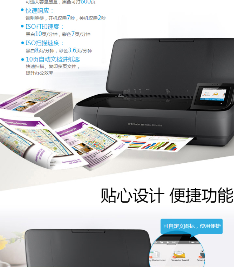 惠普(HP)OfficeJet 258 A4 彩色單功能移動(dòng)便攜式打印一體機(jī) 無(wú)線打印