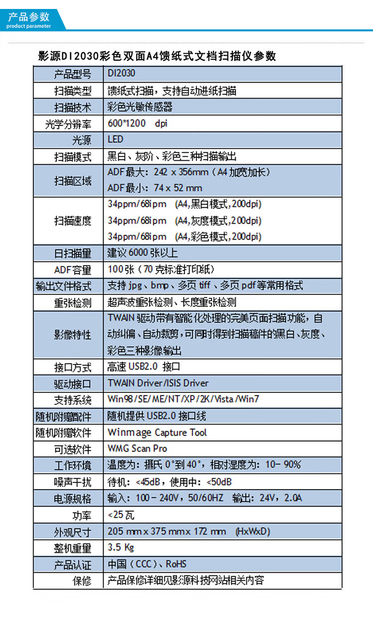 影源/WinMage DI2030 掃描儀 彩色雙面高速打印文檔掃描儀 自動雙面掃描 600dpi分辨率 全國產(chǎn)化掃描儀