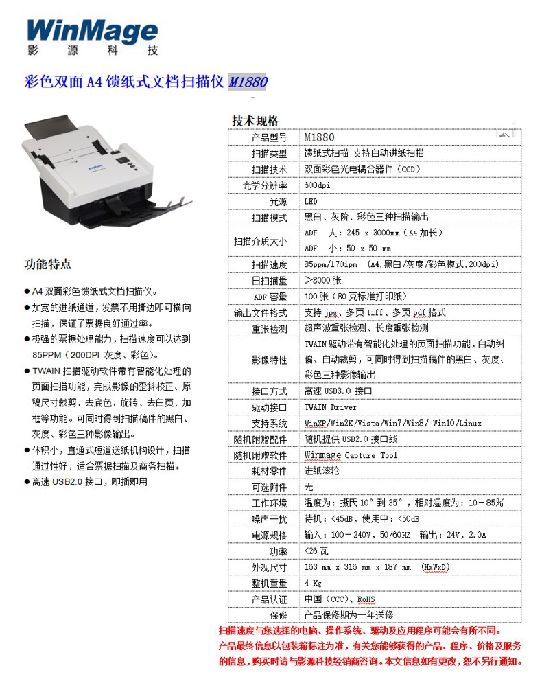 影源/WinMage M1880 掃描儀 國(guó)產(chǎn)彩色雙面A4饋紙式高速票據(jù)合同檔案掃描儀