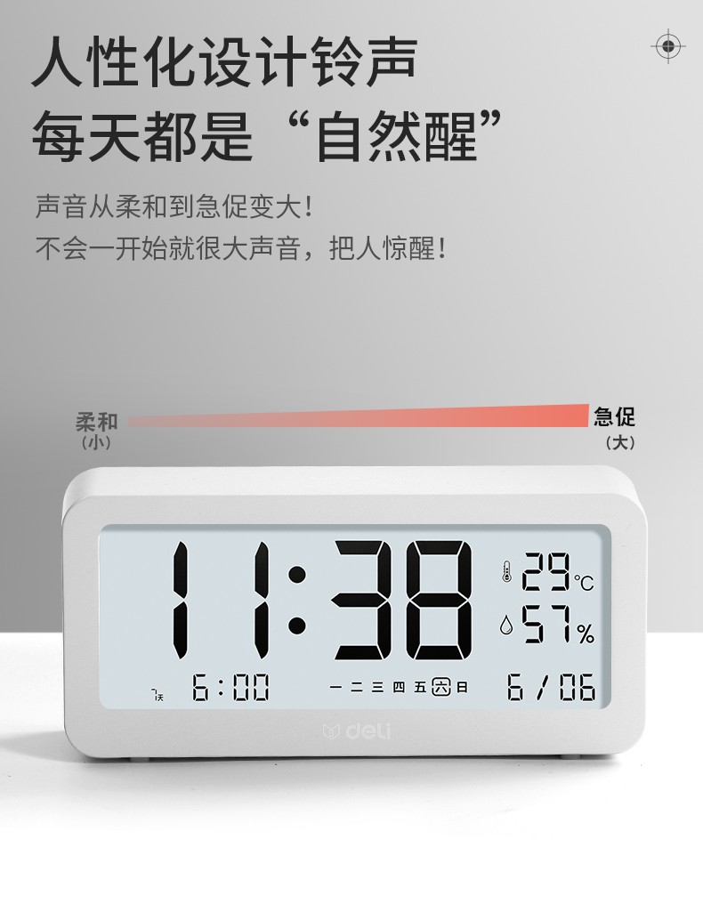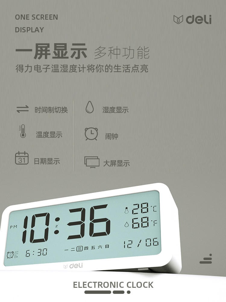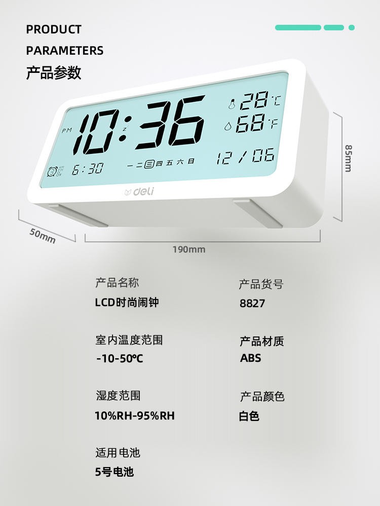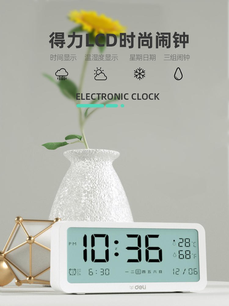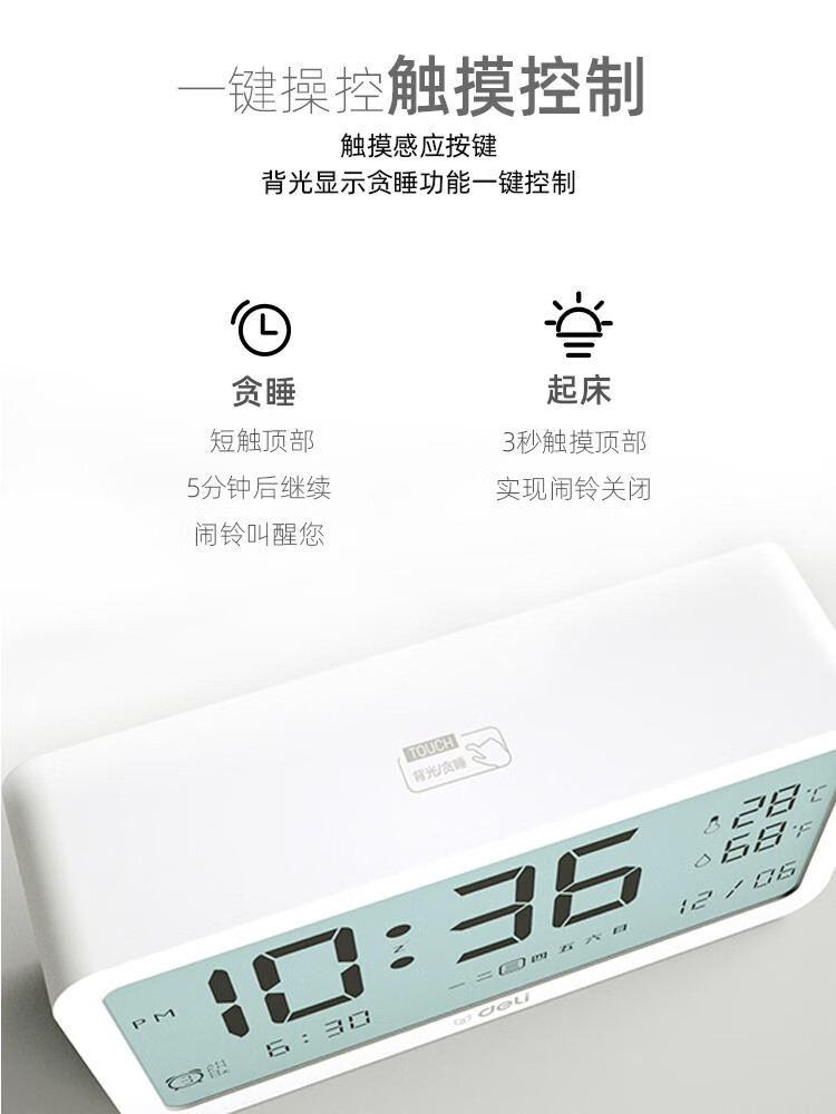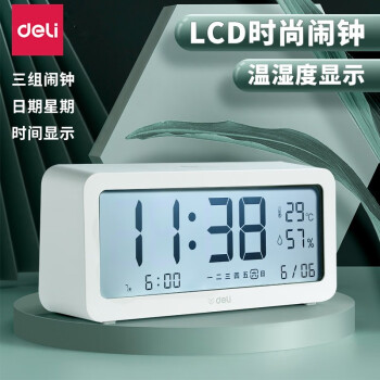 得力/deli 8827 座鐘 多功能電子鬧鐘學(xué)生用臥室床頭簡(jiǎn)約智能溫濕度計(jì)桌面夜光靜音數(shù)字智能時(shí)鐘表 大號(hào)白色【192*88*50mm】