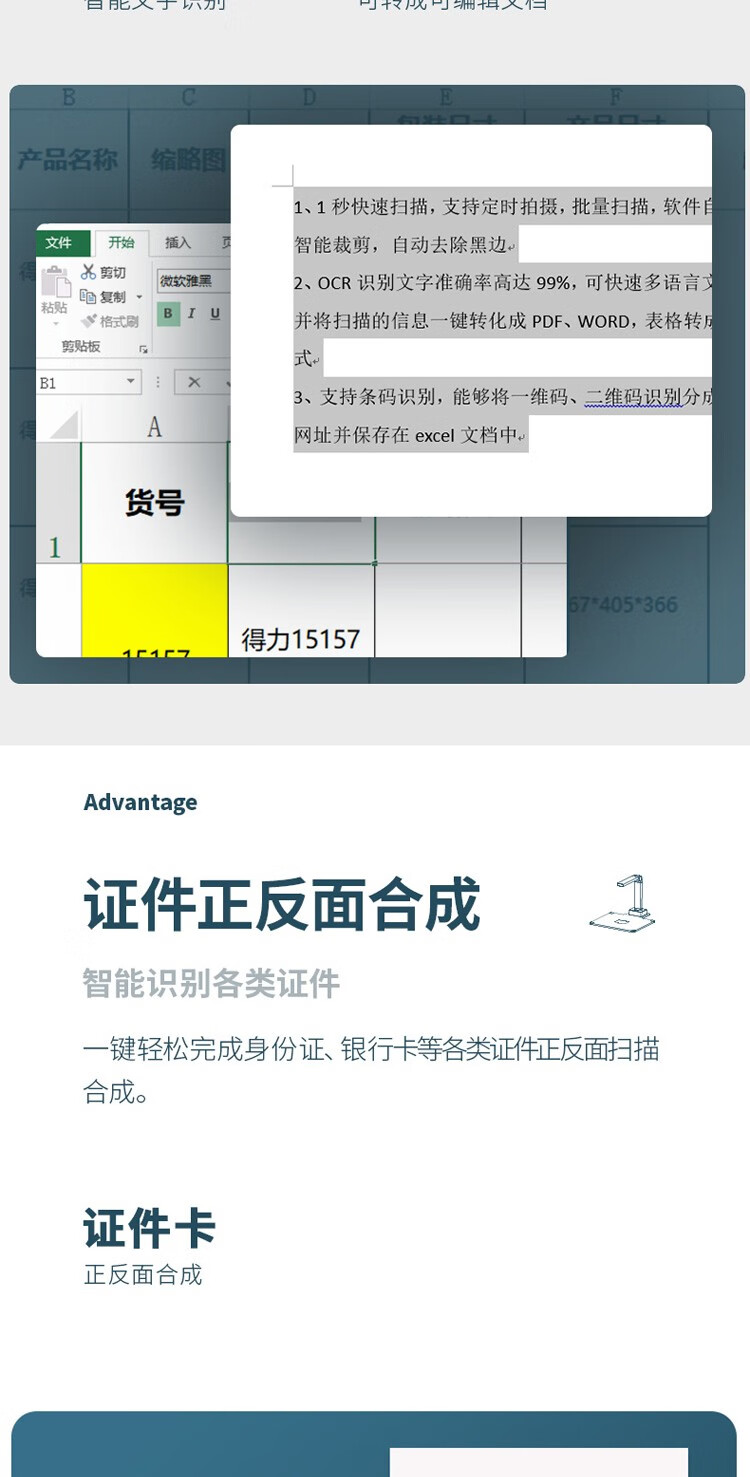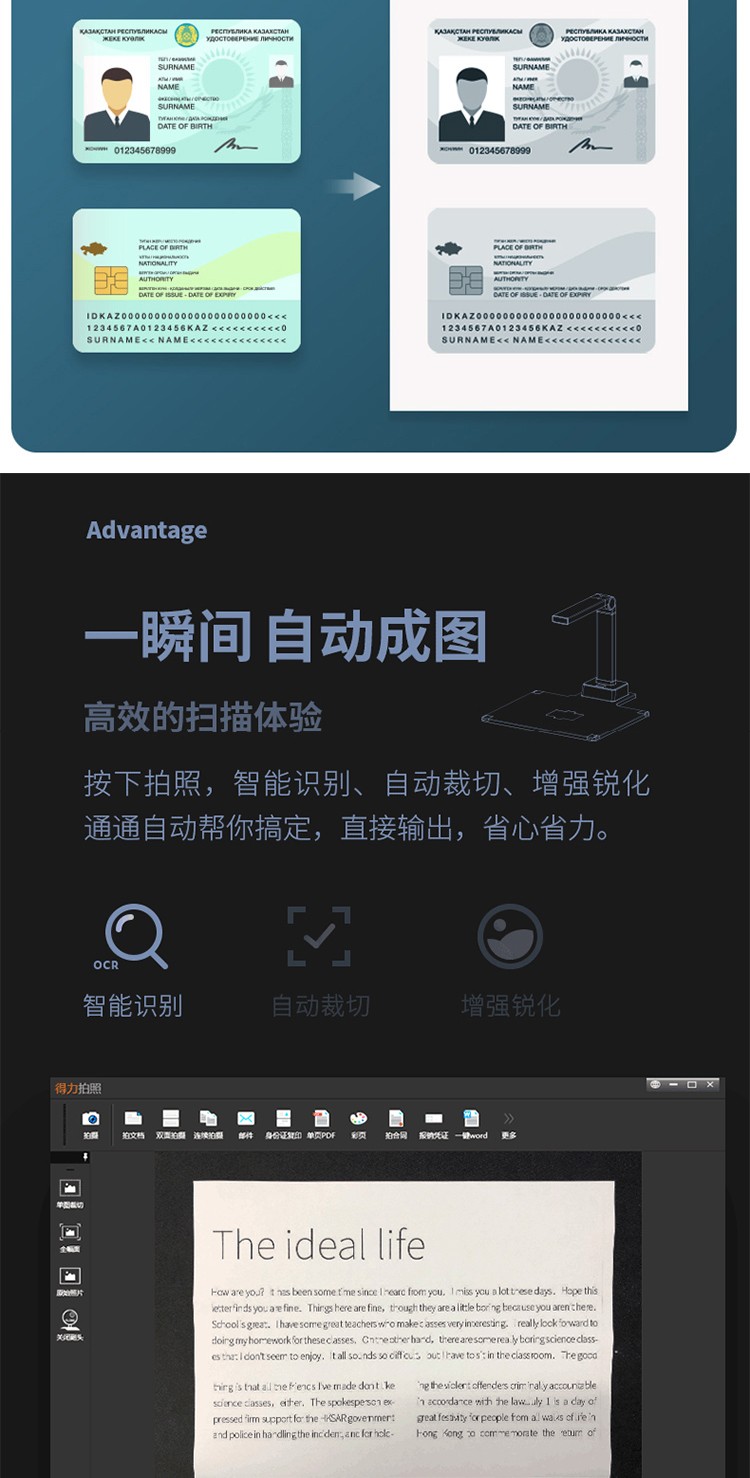 得力/deli 15157 高拍儀 A4/A3幅面高清高速掃描儀帶身份證識別文件試卷檔案高速掃描儀圖文轉(zhuǎn)換 1500萬像素自動對焦高清投影 A4幅面15157