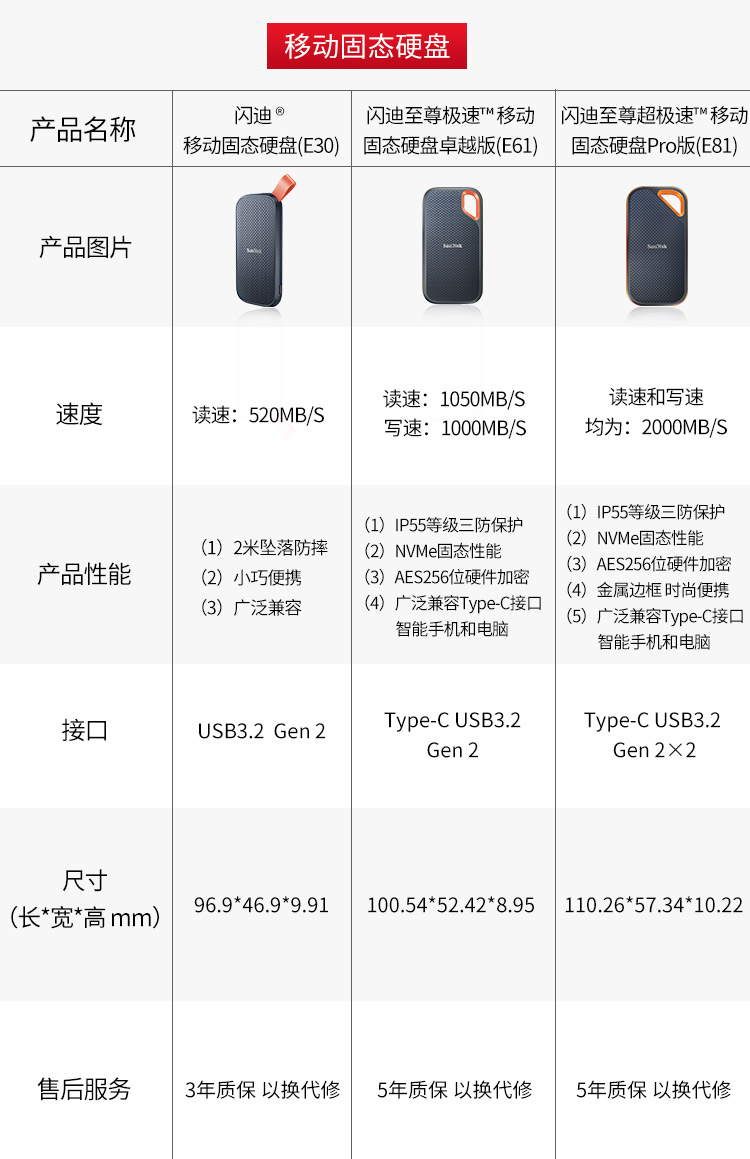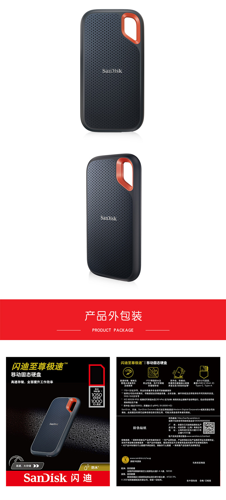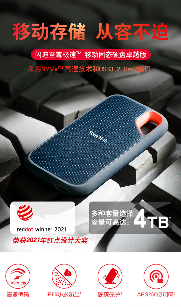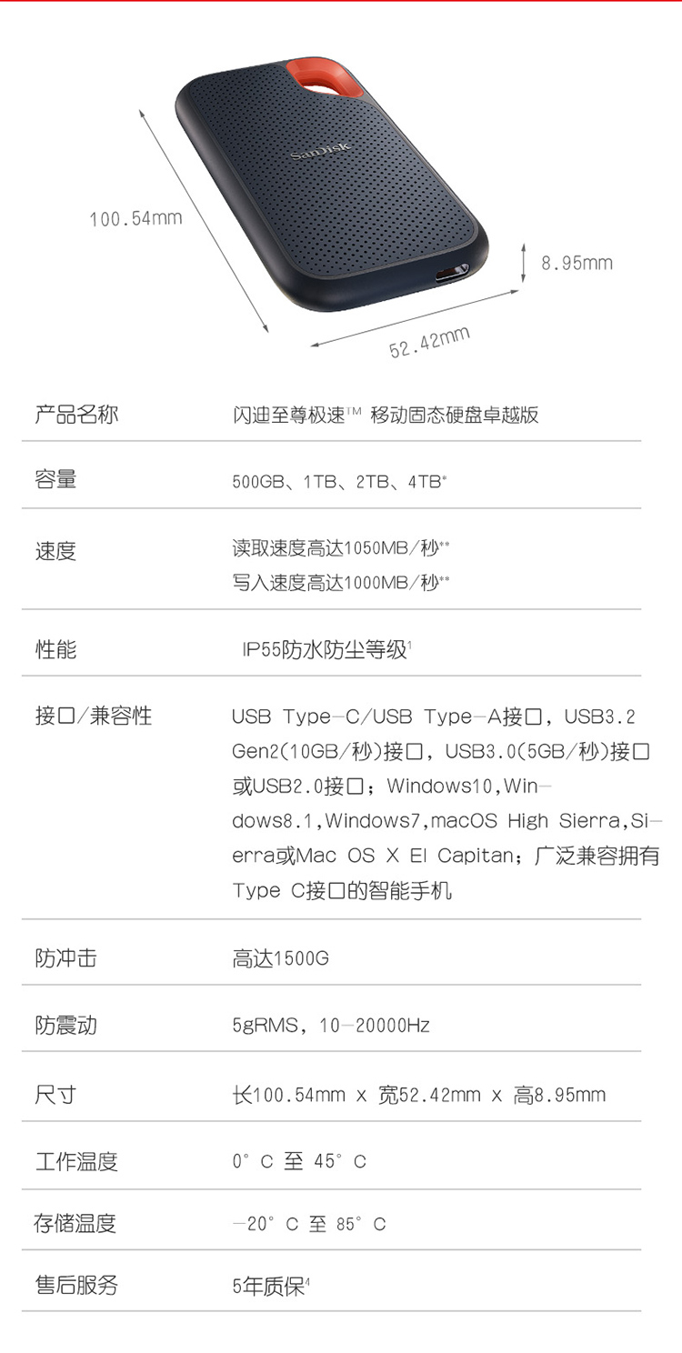 閃迪(SanDisk)E61 移動硬盤 4TB Type-c 移動固態(tài)硬盤(PSSD)極速移動版 傳輸速度1050MB/s IP55等級三防保護(hù)
